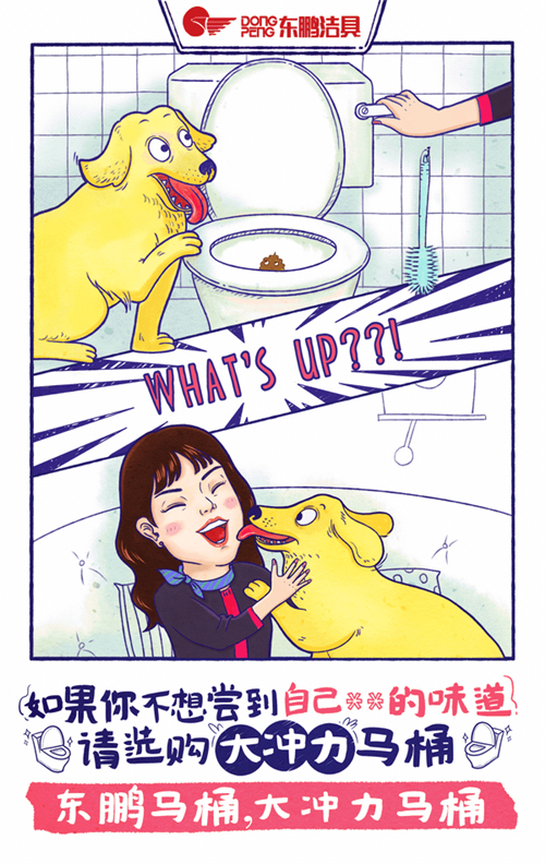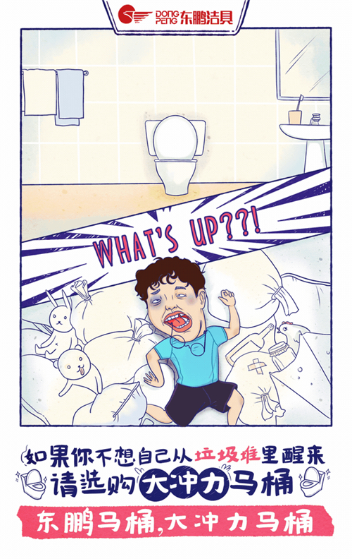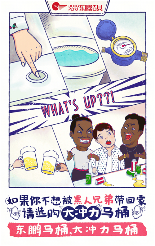 故事脑洞很大,用一个让人印象深刻的方式诠释一个消费者本身都意识到但确实存在的问题:如果没有选择好一款马桶,带来的尴尬与烦恼也是不可估量的,想避免这一切,你需要一个大冲力的马桶,东鹏马桶大冲力马桶。