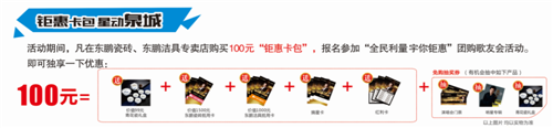 活动期间,凡在东鹏瓷砖、东鹏洁具专卖店购买100元“钜惠卡包”,报名参加“全民利量 宇你钜惠”团购歌友会活动。即可独享以下优惠: