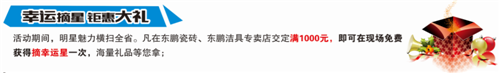 活动期间,明星魅力横扫全省。凡在东鹏瓷砖、东鹏洁具专卖店交定满1000元,即可免费获得摘“幸运星”一次,海量礼品等您拿;