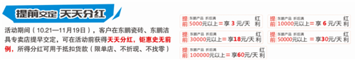 活动期间(即日起—11月19日),客户在东鹏瓷砖、东鹏洁具专卖店提早交定,可在活动前获得天天分红,钜惠史无前例,所得分红可用于抵扣货款(限单店、不折现、不找零)