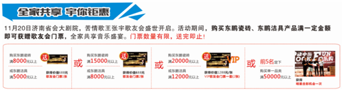 11月20日济南省会大剧院,苦情歌王张宇歌友会盛世开启。活动期间,购买东鹏瓷砖、东鹏洁具产品满一定金额即可获赠歌友会门票,全家共享音乐盛宴。门票数量有限,送完即止!