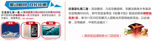 二重礼:活动期间,凡在东鹏瓷砖、东鹏洁具各大专卖店交定每满3000元,即可凭定金单及《钜惠卡包》到活动现场领取抽奖券1张,参与11月20日东鹏万人团购当天现场抽奖活动。以此类推,交得越多,中奖机会越大!