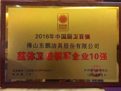 10月27日,以“升级突破,持‘质’以恒 ”为主题的2016中国厨卫年会在广东中山隆重举行。在当天晚上的“中国厨卫百强”颁奖晚宴上,东鹏洁具,凭借强大的综合实力和品牌影响力荣获 “整体卫浴领军企业10强”称号。
