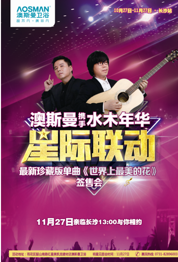 11月27日,澳斯曼卫浴联袂水木年华在长沙举行最新珍藏版单曲《世界上最美的花》签售会,想要近距离与水木年华互动,赶紧报名,不要再错过了!如果再错过这次的签售会,那就只能等明年咯~