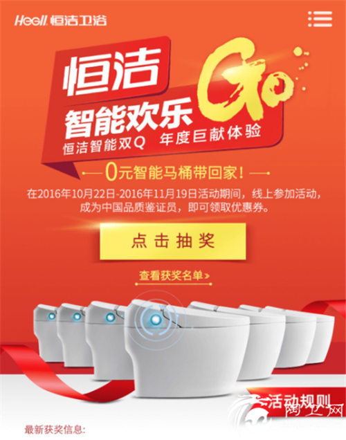 大型线上抽奖平台的开发,帮消费者实现零元拥有高配智能马桶的心愿,这是美梦成真的体验;各省区的大型落地活动,董事长、总裁等公司高层亲临一线与消费者亲密互动,为恒洁产品品质及服务代言;各地活动流程以消费者方便为本,增加消费者在游戏中的获奖率,这是欢乐嘉年华的体验;当然,最重要最根本的体验还是产品的品质,而以Q8等为代表的,智商高情商更高的智能双Q坐便器则回应并满足了消费者的需求——这事实上也是恒洁卫浴发起智能欢乐购最大的初心!