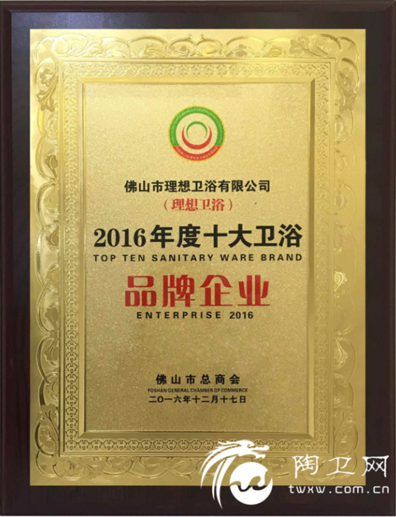 2016年12月17日, 2016年度第十五届中国(佛山)民营陶瓷卫浴企业家年会在佛山皇冠假日酒店隆重举办。理想卫浴与众多行业大咖齐聚一堂,共同见证了2016年度陶瓷卫浴各大奖项的荣耀诞生。其中理想卫浴凭借强大的综合实力,荣获“2016年度十大卫浴品牌企业”。