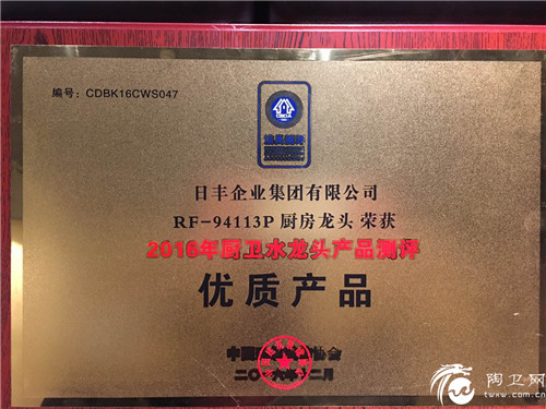 1月12日,卫浴行业的重要盛事--金龙头、金花洒、金马桶奖颁奖礼在杭州隆重举行。该评选活动由中国建筑装饰协会主办、厨卫工程委员会联合中国建筑卫生陶瓷协会卫浴分会承办、国家陶瓷及水暖卫浴产品质量监督检验中心和国家节水器具产品质量监督检验中心进行全程技术支持的专项测评调研活动。日丰企业集团有限公司的三个产品:单把面盆混合龙头RF-9172AP(饮用水)、单把厨房感应抽拉混合龙头RF-94113P(饮用水)、自洁手持花洒组995145荣获其中优质产品奖。