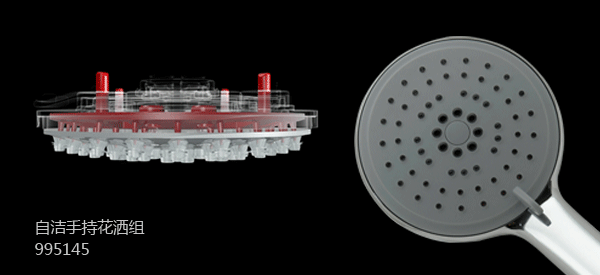 带自洁功能的手持花洒组995145。在平时的一开一关中就能自动清洁出水孔,有效防止堵塞。