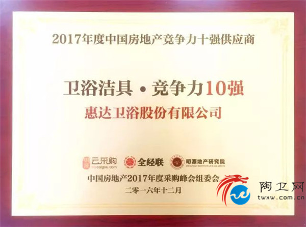 惠达卫浴此次获得“卫浴洁具·竞争力10强”殊荣,既是广大消费者的大力支持,也是房地产企业对惠达卫浴的高度认可。未来,惠达将以更优质的服务、更专业的产品,为房地产行业的发展贡献更多的力量!