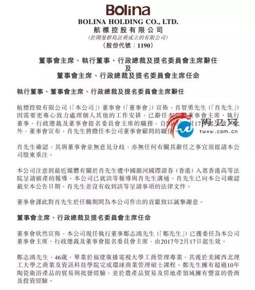 陶卫网讯 2017年2月20日,航标控股宣布,肖智勇因需要更专心致力处理个人其他的工作安排,已辞任公司董事会主席、执行董事、行政总裁及董事会提名委员会主席的职务,并由现任执行董事郑志鸿接替其职务。