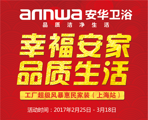 伴随着新一年春节过后的余温,新一轮家装热潮蓄势待发,2017年2月25日,安华卫浴工厂总部在上海吹响了促销活动的号角,此次主题为“幸福安家 品质生活”的3.18惠民家装活动,是安华工厂在上海举办的大型让利促销活动。本次活动由安华卫浴总部全盘策划,直达上海全面让利,以顶级的品质,实惠的价格感恩回馈千千万万的上海业主,让所有消费者买的放心、用的舒心。