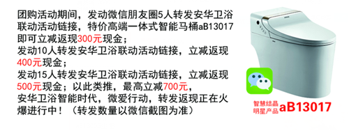 二、【智能时代,微信转发返现】 安华卫浴上海联动工厂大补贴,感恩回馈广大业主,以最实惠的价格,顶级的品质让利广大的业主朋友们。