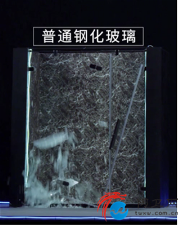 从实验中看到,此时碎裂玻璃渣飞溅,原来的活动门失去受力支撑,很快倒了下来,可以想象,如果此时有人正在淋浴,一起伤人事故无可避免!