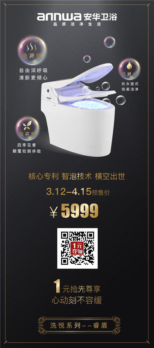 安华卫浴洗悦系列“睿盾”,核心专利智泡技术,独特的致密泡沫,有效隔绝异味、防溅水,可选薰衣草、柠檬、桂花、玫瑰四种芳香隔层,颠覆如厕体验——这么完美的马桶,你怎么忍心错过?