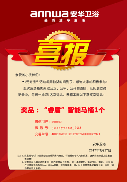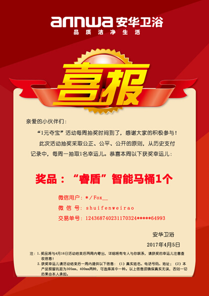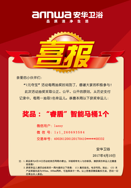 2. 奖品将4月16日后两周时间会安排寄送马桶,部分运费需要获奖者支付;