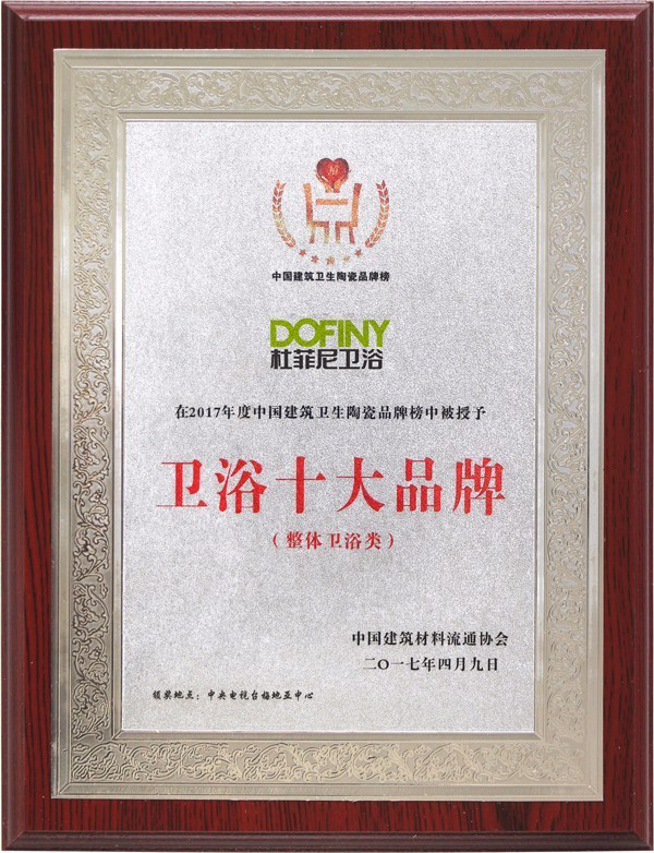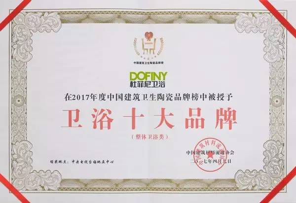 第六届中国建筑卫生陶瓷品牌大会暨第二届全国陶瓷/卫浴经销商大会于4月9日在北京中央电视台梅地亚中心如期举行。国务院及中央相关部委领导、行业协会领导以及瓷砖卫浴行业600多位厂商精英共同出席行业“两会”。杜菲尼受邀参与此次盛会,作为卫浴行业代表,接受2017年卫浴十大品牌的表彰。