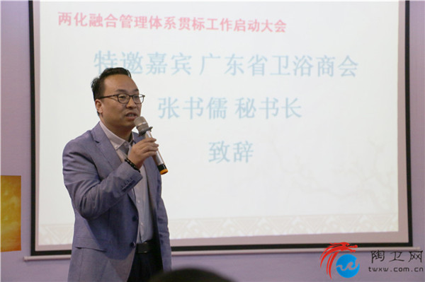 广东省卫浴商会秘书长张书儒先生发表致辞。他对赢伽公司举办两化融合贯标启动大会表示了祝贺。不谋万世者,不足谋一时;不谋全局者,不足谋一域。临大势,贵在顺而有为,赢伽公司自成立以来,顺应时代潮流发展,积极响应国家号召,为促进行业供给侧改革、工业4.0发展起着行业先锋作用。同时,他表示,国家政策强力推进两化融合,作为首批获得两化融合管理体系贯标启动试点资质企业,赢伽公司是我省卫浴行业推向工业化、信息化发展之路的排头兵,为行业的创新发展做出了表率和贡献。张秘书长对赢伽公司的发展表示了高度肯定与赞赏。