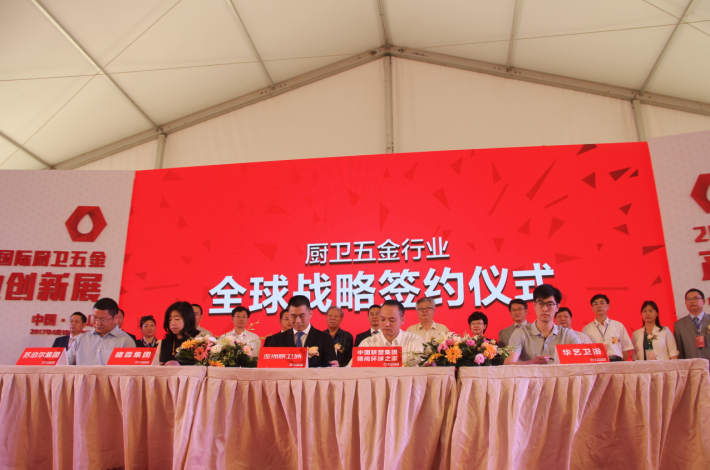 作为开幕式上的一大亮点活动,厨卫五金行业全球战略签约仪式赚足了眼球。这是亚洲厨卫城联合中国联塑集团领尚环球之家以及江门、厦门、潮州、佛山等产区的知名企业代表共同开展全球战略合作,汇聚科研、产业、资本、文化等跨界资源,助力中国创造走向世界。民族的,才是世界的。随着全球化进程的加快,中国厨卫五金行业的全球化步伐将走得愈加坚定。在商协会领导和江门市政府、鹤山市政府领导的共同见证下,厨卫五金行业全球战略签约仪式成功进行。