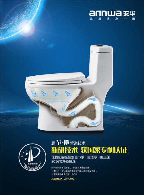 安华卫浴 “超节净”专利管道技术,通过优化特殊单管道管径设计,能瞬间冲走污垢,与传统管道相比较,动力得到100%的提升,达到一次冲净污物,更节水更洁净。此外,采用微晶釉技术,4次均衡施釉,不易发黄、不龟裂、使用寿命长,同时由于在釉料中添加了正价阴离子,还具备抑菌功能,是业界的洁净典范。