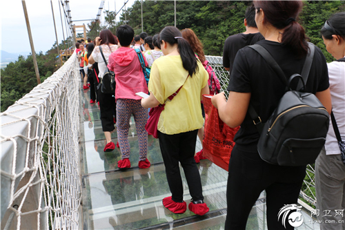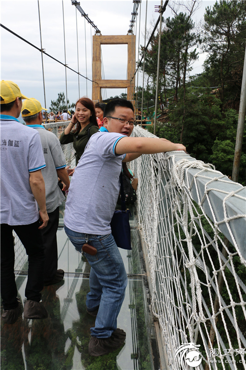 山路非常陡峭,刚下过雨的路面有些滑,勇敢的伽人们丝毫没有懈怠,很快便到达玻璃栈道。玻璃栈道是用三层夹胶玻璃稳固修筑而成,没有破裂危险。尽管伽人们都清晰明白这个桥梁的安全性,然而,几百米的高空与略有晃荡的感觉,仍然让不少同伴心有戚戚然。也有不少伽人们在桥上谈笑自若,来去自如,各种自拍,不得不令人佩服。