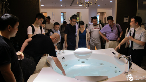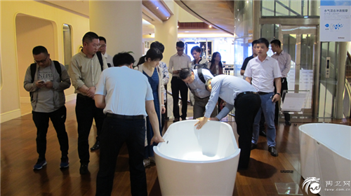 考察团对浪鲸卫浴的浴缸表示出来极大的兴趣,浪鲸浴缸的外观设计紧随国际设计前沿,凭借过硬的生产实力享誉海内外市场,考察现场,嘉宾们对浪鲸产品爱不释手,频频咨询产品的设计及工艺技术问题,看到这款超薄对接贵妃缸时,几位嘉宾不由得上前摸索研究一番,并对浪鲸的产品工艺细节处理表示钦佩。