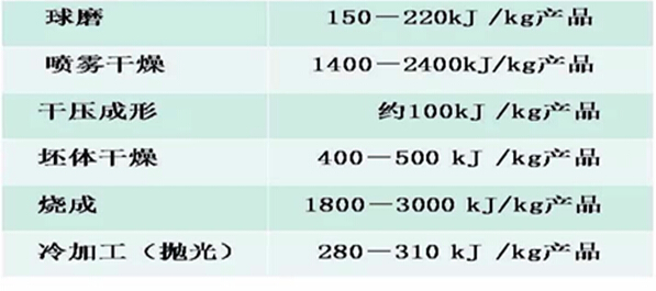 从上表可以看出,陶瓷砖的主要能耗在制粉(包括球磨和喷雾干燥)和烧成两个工序,制粉的耗能基本接近烧成。但是两个工序存在实质性差异:制粉的耗能大部分是用于水分蒸发,这些水大部分是为了原料细化而人为加进去现在已经失去作用要出去的,而烧成耗能是陶瓷制品形成产品特性的吸热反应必需。