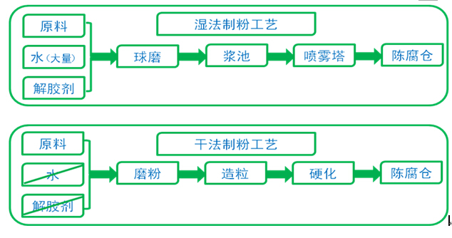 从上面工艺流程简图可以看出干法制粉和湿法制粉最大的区别是原料细化环节不再大量外加水进去,这样后面就不要配置干燥设备喷雾塔,实现大幅度减少去除这些水所需消耗的能源,同时减少为了维持浆料性能所加入的多种添加剂。