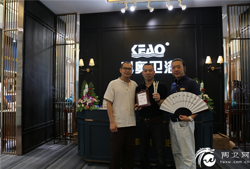佛山市卫浴洁具行业协会设计委员会会长张艾斌(左一)、秘书长焉莫(右一)现场为吴冠成总经理(中间)颁奖