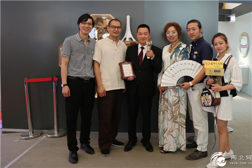 广东职业技术学院卫浴产品设计系主任、陶瓷卫浴研究院院长肖机灵(左一)佛山市卫浴洁具行业协会设计委员会会长张艾斌(左二)法标珠光卫浴总经理张友谊(中)佛山市卫浴洁具行业协会设计委员会秘书长焉莫(右一)现场颁奖