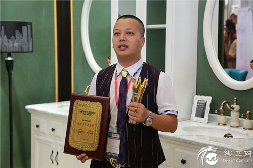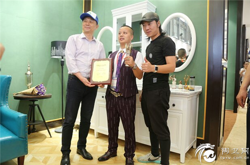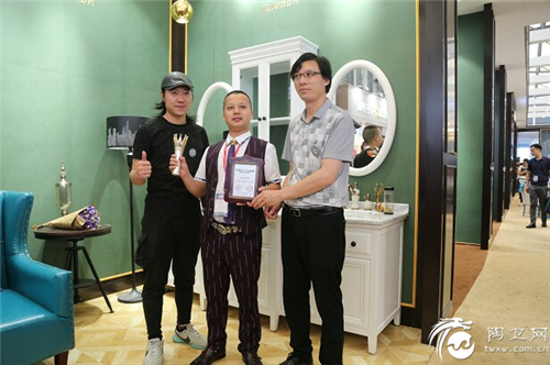 佛山市卫浴洁具行业协会设计专委会秘书长焉莫(左)广东职业技术学院卫浴产品设计系主任肖机灵(右)为木立方丁伟(中)颁奖