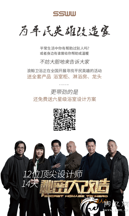 在我们身边,像这样的平凡英雄不计其数,浪鲸卫浴不光为节目中的12位英雄改造卫浴空间,我们希望让身边更多的英雄得到卫浴空间体验,平常生活中你有帮助过别人吗?或者印象中身边有谁曾给过你帮助或温暖?不妨大胆地来告诉大家!浪鲸卫浴正在全国开展寻找平民英雄的活动,如果您有幸被选上,浪鲸送您全套产品 浴室柜、淋浴房、龙头…….更带劲的是 还免费送六星级浴室设计方案如此豪礼,还不赶快参加??请扫二维码,快速进入报名通道,请把您或您身英雄的故事告诉我们~