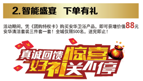 安华百店让利,百万业主亲征,尊享百万豪礼。本次泉城联动工厂特供,无购物送签到礼、订单不限金额送豪礼、订单满1千送淋浴屏风、订单满2千抽家电大奖、订单满3千砸金蛋豪礼、工厂返现史无前例等大力度让利优惠来势凶猛,把空前的优惠与福利服务广大济南地区的业主朋友们,活动现正火爆预售中。
