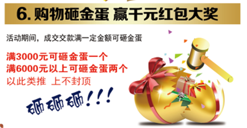 六、购物砸金蛋,赢千元红包大奖;交款满3千抽一次,以此类推,不封顶。