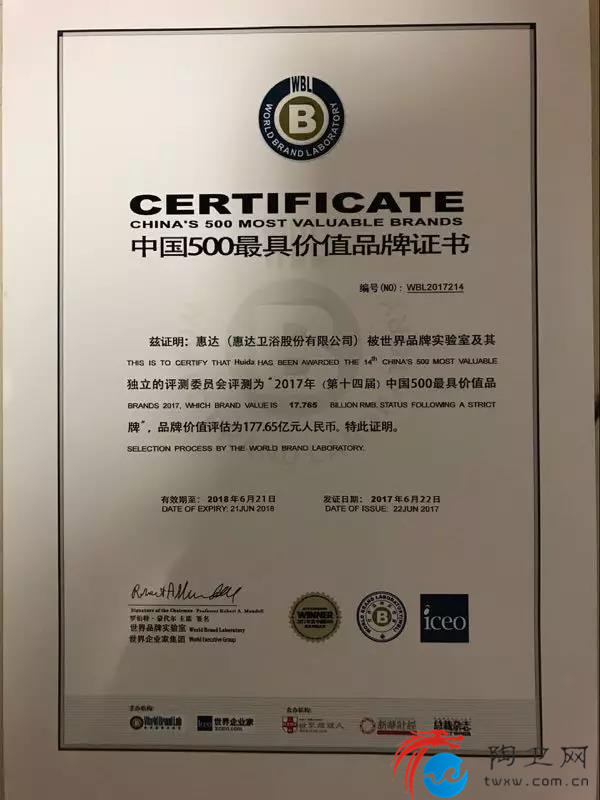 6月22日,2017(第十四届)“世界品牌大会(World Brand Summit)暨中国500最具价值品牌发布会”在北京如期举行。会上,世界品牌实验室发布了最新的《中国最具价值品牌500强》榜单,惠达卫浴以177.65亿元品牌价值,名列榜单第214位,再次稳居行业前列!