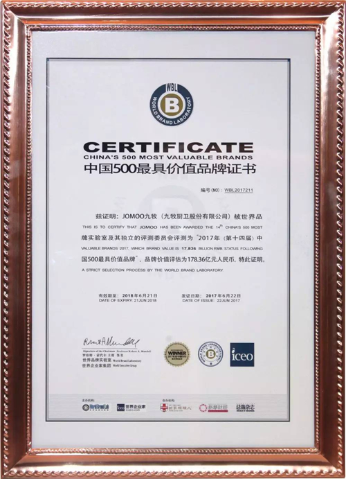 6月22日,由世界品牌实验室主办的第十四届“世界品牌大会”在北京举行,会上发布了2017年《中国500最具价值品牌》分析报告。在这份基于财务数据、品牌强度和消费者行为分析的年度报告中,九牧以178.36亿元的品牌价值荣登本年度卫浴行业品牌榜首,连续六年蝉联卫浴行业第一!
