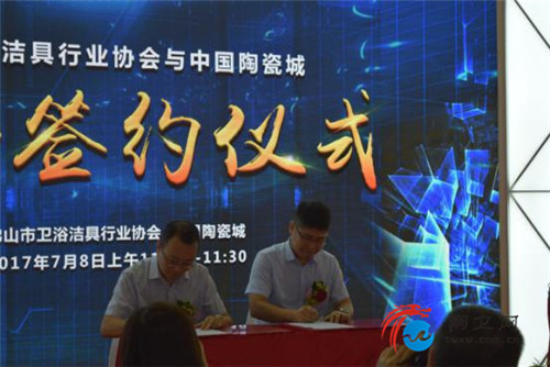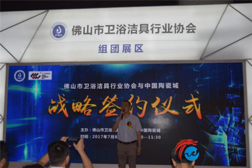 在佛山卫浴洁具展团启动之后,为了使佛山市卫浴洁具行业协会与中国陶瓷城双方关系更进一步,佛山市卫浴洁具行业协会秘书长刘文贵先生与中国陶瓷城总经理 高原先生举行了战略签约仪式,特此也希望卫浴行业在双方强强联手的帮助下更加壮大。