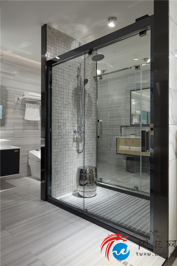 另一个空间亮点是它的磁悬浮电动淋浴房——这是由欧派卫浴首次研发并推出的,属于全球首款。依据磁悬浮原理设计而成,成功打破了传统磁悬浮技术难实施、制造成本高的壁垒。我们注意到,它的电动淋浴房的玻璃外观,可按实际需求定制,非标化在这里也是一种体现。它还具备静夜无音、系统寿命长达30年以上的特定;同时直线电机、控制单元采用灌胶处理,防水性能极佳,达到国家最高防水等级IP68。此外,它采用24伏超安全电压作为驱动电源,低于人体安全电压,确保使用安全,A级绝缘等级,不漏电,可以实现自动感应,兼具防夹、防撞功能。