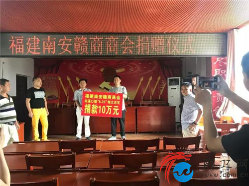 7月29日上午,南安市赣商商会企业家代表团在江西省修水县溪口镇政府举行抗洪救灾捐赠仪式,为家乡灾后重建奉献爱心。 (据悉,6月23日,修水县遭遇37年来罕见特大暴雨,造成了严重的洪涝灾害,群众损失惨重。)