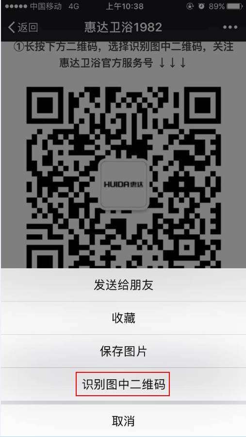 ② 选择识别图中二维码(如图所示),关注惠达卫浴官方服务号