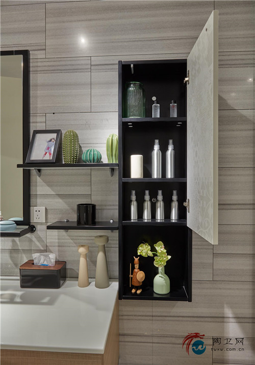 采用大容量收纳柜设计,将墙面上的空间充分利用了起来。浴室柜门采用免拉手反弹开合设计,简约时尚又便捷。门板采用中性色双饰面板配亚光黑色烤漆柜体,完美地营造出了一种沉稳温馨的氛围。上方吊柜的独特花纹若隐若现,起到了点缀空间的作用。一体式的毛巾架,层板架的结合,不但可以提高美观度而且还提升了实用度。白色纳米台面与细腻的木纹主柜搭配,凸显了经典与时尚,运用白色系作为台面,撞色处理又显得非常简洁、稳重、大气,而且中性色调门板采用的是无封边黏结处理,防水性能极佳。