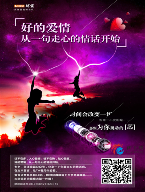 七夕,关注晾霸公众号,分享一下你最走心的情话吧。你想说的,说不出口的爱,让晾霸帮你诉说。在文末留言,让TA看见你的爱。留言点赞最多前10名,即可获得晾霸七夕节高端壕礼——太空铝多功能晾衣架一件哦!时间截止至2017年8月28日23:59。