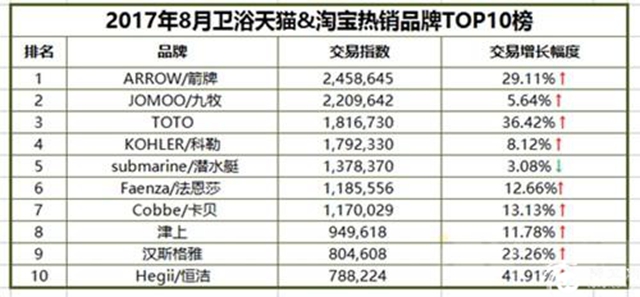 近日,卫浴行业信息平台中洁网汇总了天猫和淘宝8月的电商数据,梳理了销量排行榜排名前十的卫浴品牌,其中有9家交易量在这个传统的淡季均呈现增长态势。增幅排名前三的箭牌卫浴、TOTO、汉斯格雅增长幅度都超过了20%。