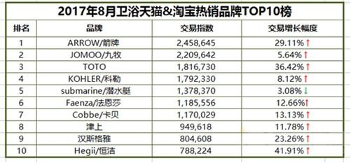 近日,卫浴行业信息平台中洁网汇总了天猫和淘宝8月的电商数据,梳理了销量排行榜排名前十的卫浴品牌,其中有9家交易量在这个传统的淡季均呈现增长态势。增幅排名前三的箭牌卫浴、TOTO、汉斯格雅增长幅度都超过了20%。