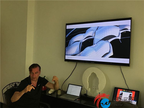 今天上午,过会儿,即2017年9月21日我又将在伦敦与扎哈事务所讨论设计,花园国际小学设计方案。图为舒马赫先生讲解江西武宁横路花园村国际小学方案。