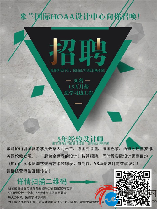 入职要求有点高:五年以上工作经验的能兼职更欢迎专职跟余工干的优秀设计师建筑师或相当实力的留学艺术设计毕业生,硕士毕业生读博士生,有到国内外创业机会,开十万家艺术家政店到国内外大社区。半年后合适者入职米兰余工设计楼月薪3万元人民币,可兼职留学。欢迎庐山训练营学员勇夺机会!