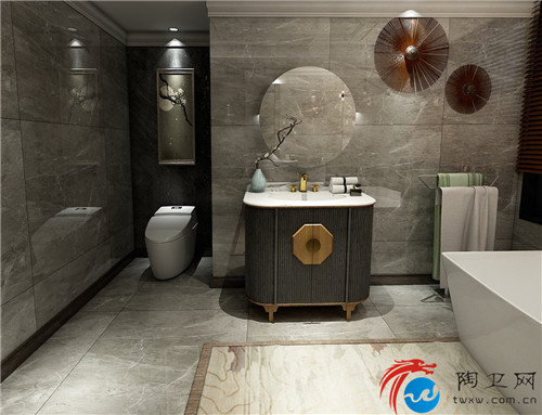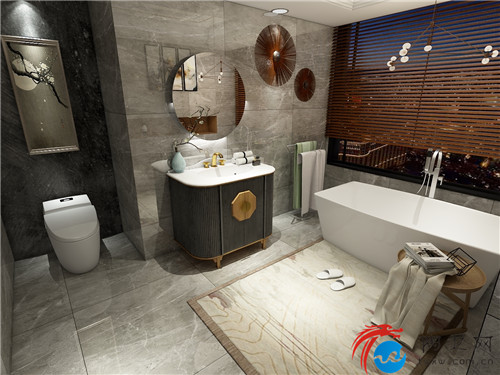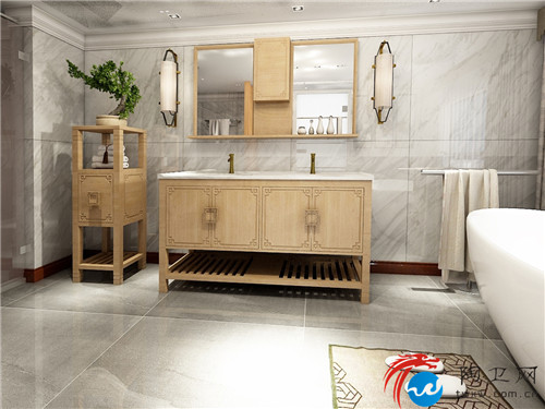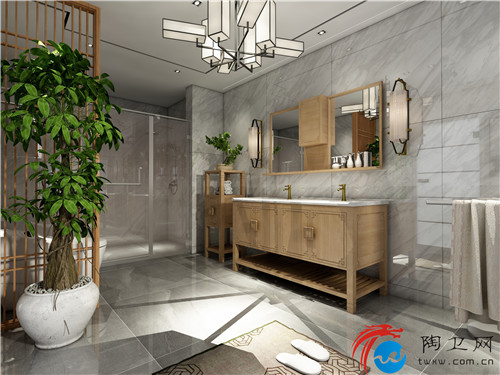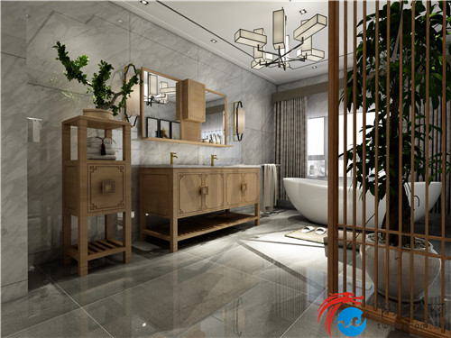 浴室柜天然的原木纹理与色泽将新中式卫浴间的质感与深意表达出来,含蓄低调的东方精神张扬在大户型的格局之中。