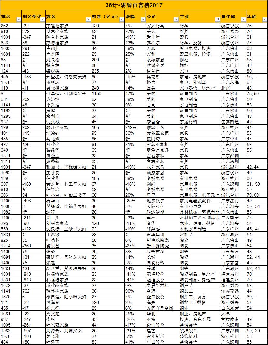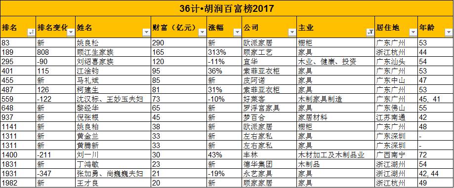 定制家居中,欧派家居姚良松以290亿元财富、顾家工艺的顾江生家族以165亿元财富、宜华木业的刘绍喜家族以120亿元财富分别占据定制家居的前三名。值得注意的是,宜华木业的刘绍喜家族此次财富总排名295,相比去年下滑90名。