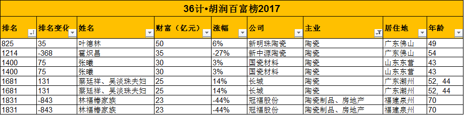 在陶瓷行业中,新明珠陶瓷的叶德林以50亿元的财富成为陶瓷行业首富,新中源的霍炽昌以35亿元的财富成为陶瓷行业第二大富豪。