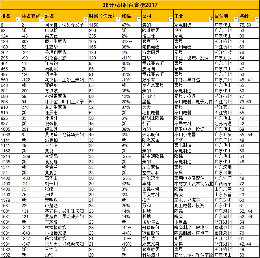 苏菲亚衣柜的江淦钧财富95亿元,位列总排名401,前进115位;皮阿诺的马礼斌以85亿元新上榜,总排名455名。