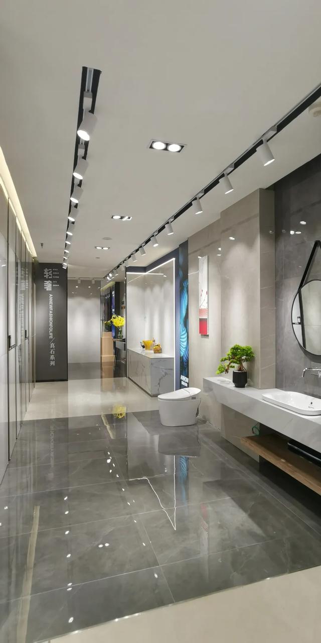 沿着商场主入口的客流动向,在前厅布置了客厅场景,突破以往的前台设计,给经过前厅的顾客提供休息空间,感受箭牌瓷砖的人文关怀。另一面则结合国际潮流趋势,逐一呈现大规格超值潮流的产品,逐步吸引顾客进入中心选材区尽情挑选。整体空间氛围简洁大气,现代雅奢,低调又时尚。重点运用展示大规格产品的样板间,帮助更多消费者实现品质生活的愿景,享受品质生活。